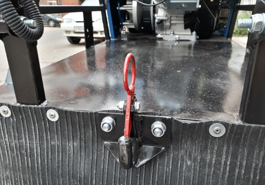 На мотобуксировщике установлен фаркоп. Это упрощает процесс крепления саней к мотобуксировщику, в отличии от стандартных прицепных устройств, где используется обычный рымболт.