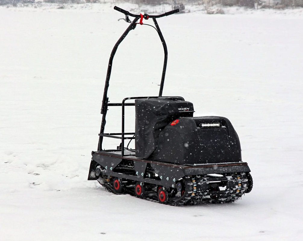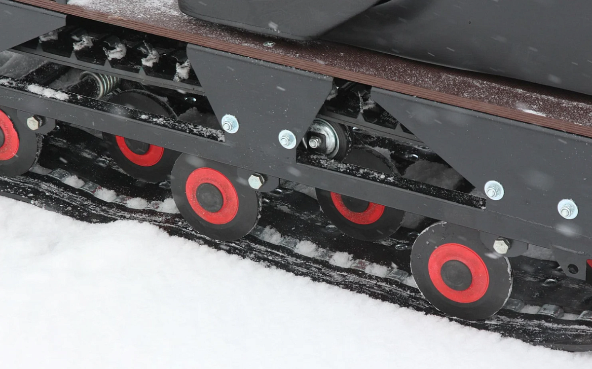 Широкая гусеница и подвеска превосходно гасят колебания, порывы ветра, а также любые неровности – холмы, ямы, колеи, камни, подъемы, раскисшие грунты, ветки деревьев и глубокие сугробы. Мотобуксировщик защищен от опрокидывания. При встрече с препятствием внутренние детали вряд ли повредятся, так как на мотособаку установлен корпус с повышенной прочностью. К тому же двигатель находится сзади Paxus 550 и при лобовом столкновении весь удар берет на себя грузовая платформа, не являющаяся сверхважным элементом.