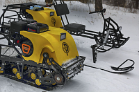 Буксировщик оснащен 4-х тактным двигателем мощностью 15 л. с., достигающий скорость до 40 км/ч. Это позволяет быстро перевозить груз до 300 кг в санях и на специальной багажной площадке мотобуксировщика. Объем двигателя составляет 420 кубов.