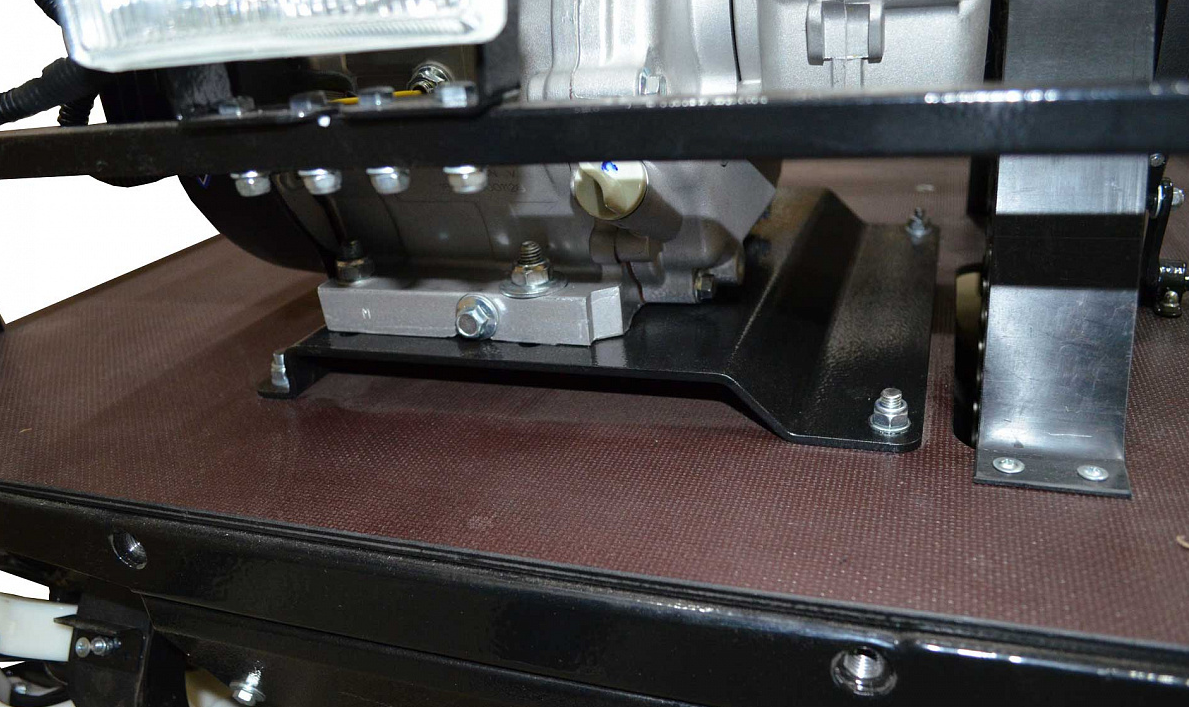 Двигатель с редуктором расположены по центру в передней части, на специальной стальной станине, надежно закрепленной к раме. Данное расположение силового агрегата, позволяет удачно сбалансировать центр тяжести, что положительно сказывается на удобстве управления буксом и создает большое багажное пространство для различных вещей, инструмента, провизии.