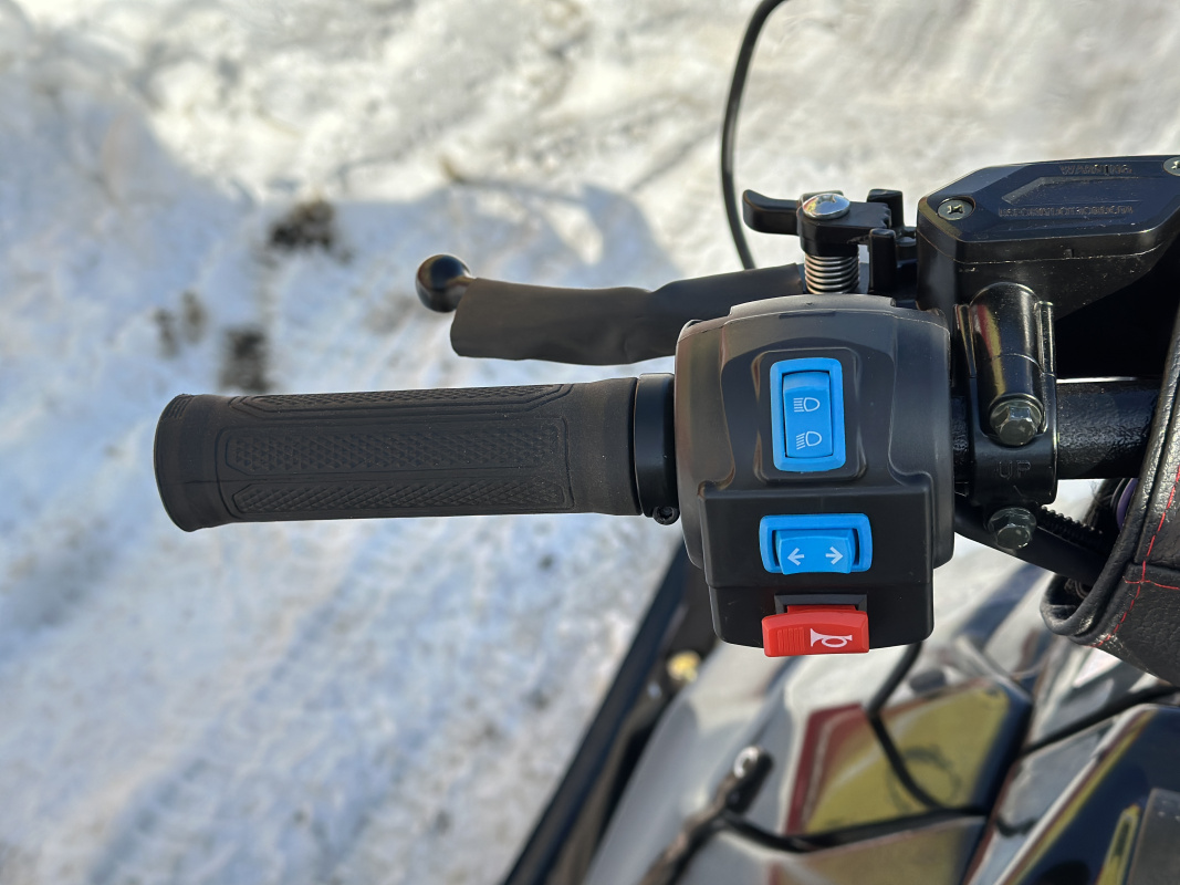 Руль снегохода IKUDZO, имеет приятные, эргономичные ручки с подогревом, а также современные блоки управления. Спинка пассажира также оборудована подогревом ручек пассажира и имеет удобную геометрическую форму. Современная панель приборов, имеет множество функций, включая показания уровня топлива, скорости, пробега, температуры двигателя и множество других функций.