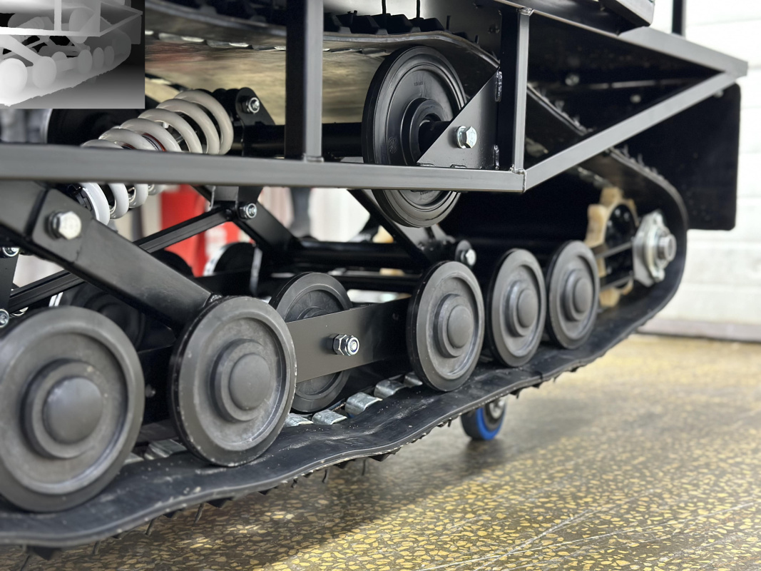 * Уникальная геометрия катков и креплений. Это отдельная гордость разработчика снегохода YAKUT. Крепкие катки с уникальной кареткой не забиваются снегом и имеют значительно больший ресурс по сравнению с классическими Бурановскими катками.