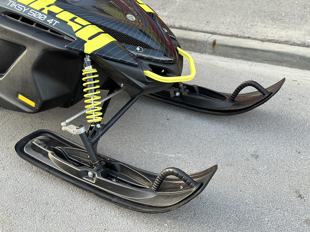 Помимо снижения шума, вибраций, выбросов снегоход стал еще и более комфортным в управлении. Применен более современный дизайн рулевого управления и пластиковых элементов корпуса. В конструкции подножек появились большие окна для исключения скопления снега. Многофункциональная приборная панель KOSO, многоступенчатый нагрев рукояток и курка газа в базе нового Тикси 500 4Т. Изменению подверглась и тормозная система: тормоз стал гидравлическим.
